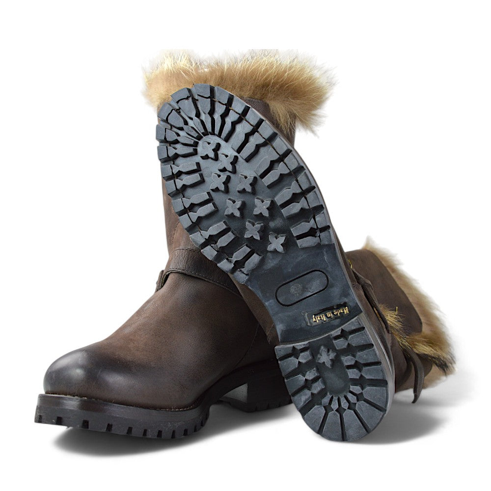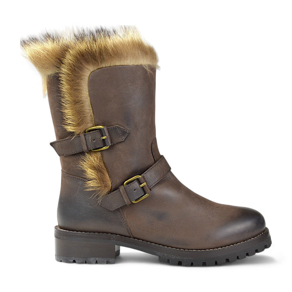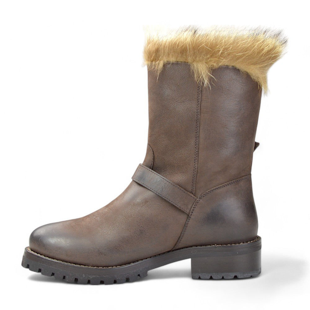 Das äußere Material besteht aus hochwertigem Leder, das dem Schuh eine matte und strapazierfähige Optik verleiht. Die Innenausstattung ist mit weichem Lammfell gefüttert, das nicht nur Wärme spendet, sondern auch für besonders angenehmen Tragekomfort sorgt. Zwei markante Lederriemen mit Metallschnallen, eine am Knöchel und eine am oberen Schaft, setzen stilvolle Akzente und bieten zusätzlichen Halt.