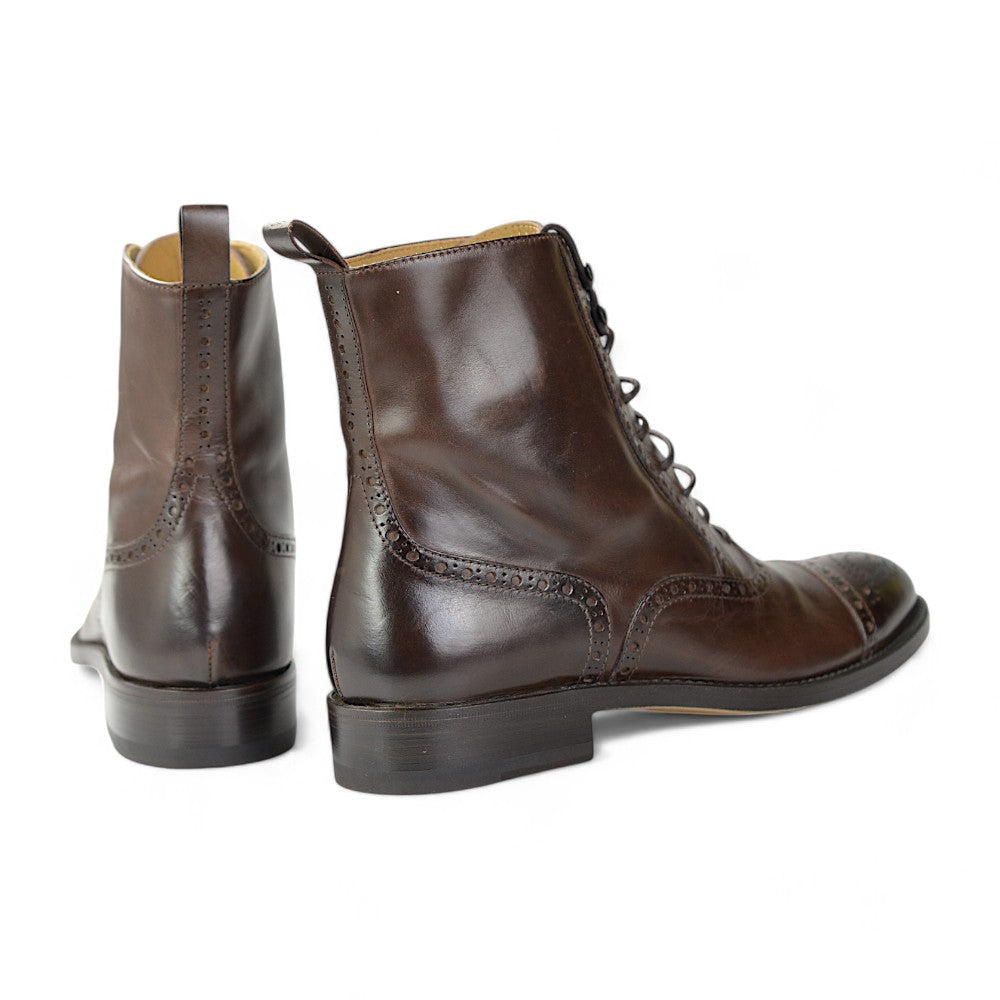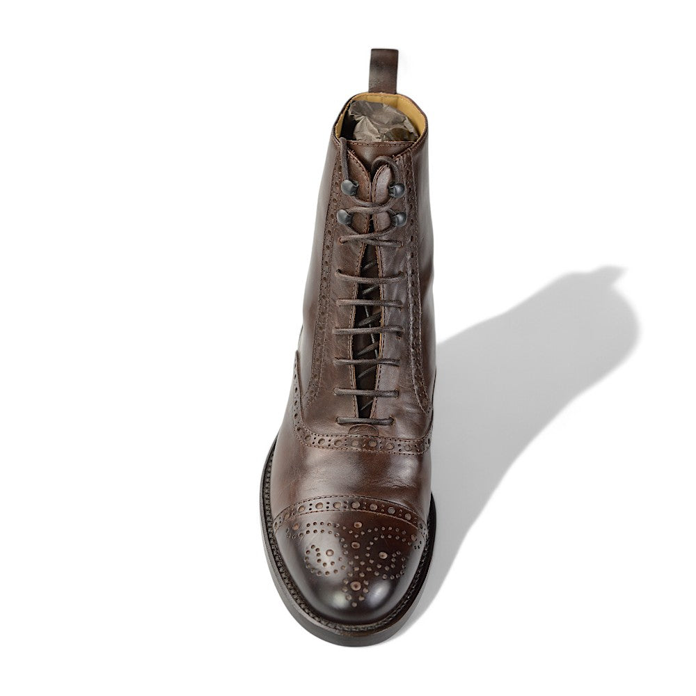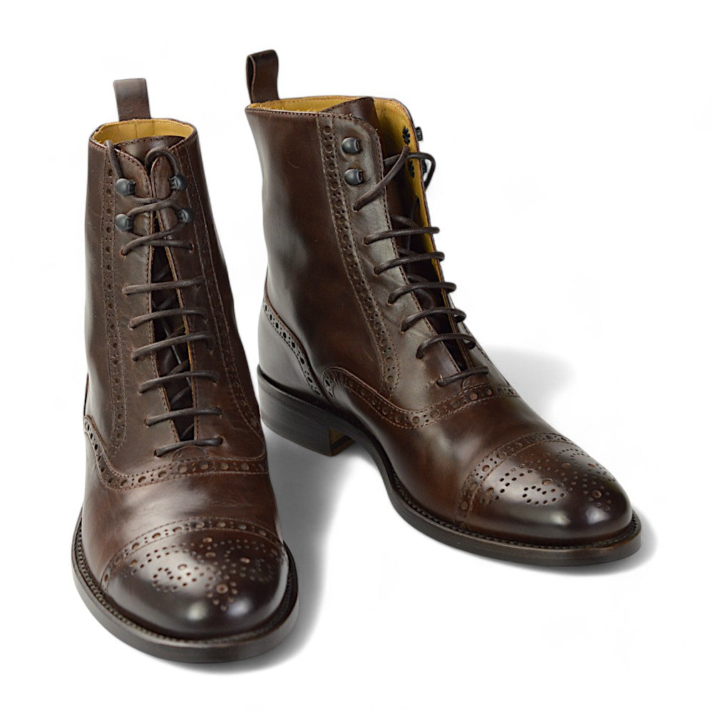 Die Stiefel sind in den Größen 36 und 38 erhältlich. Mit feinen Details wie der Brogue-Lochung und der eleganten Schnürung sind diese Stiefel nicht nur optisch ein Highlight, sondern bieten auch hohen Tragekomfort und Langlebigkeit. Die Leder-Innensohle sorgt für ein angenehmes Fußklima, während die robuste Außensohle sicheren Halt garantiert.