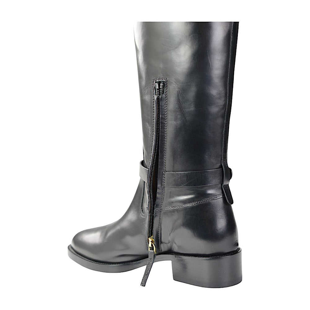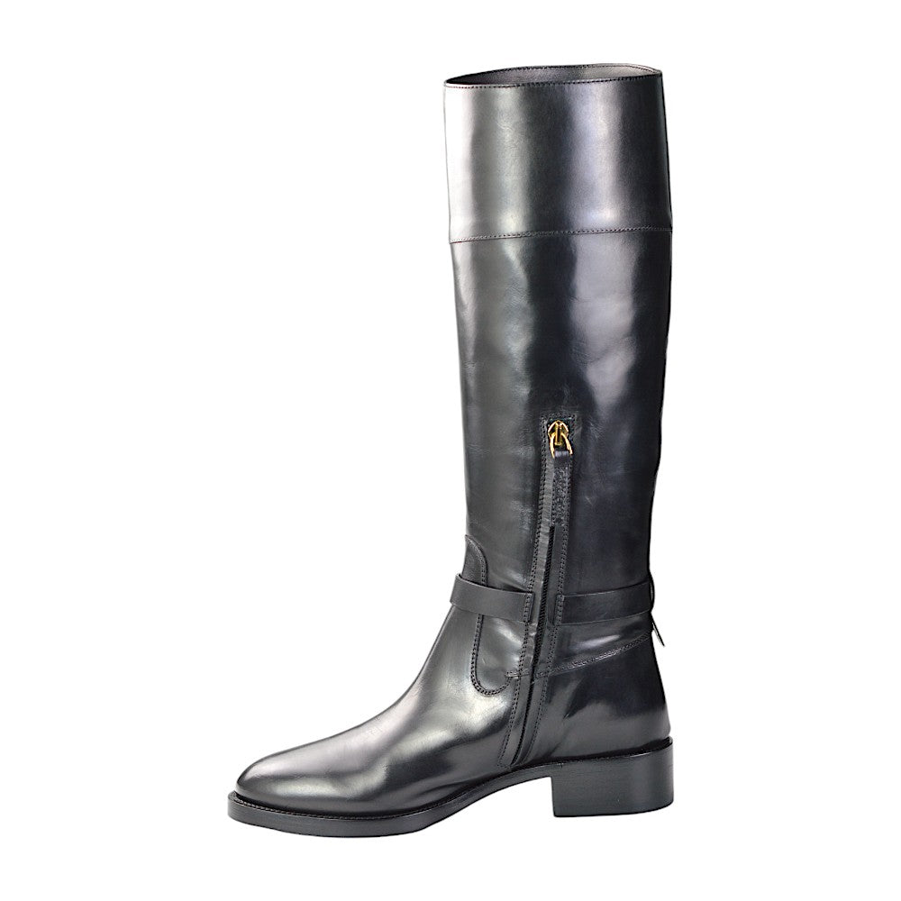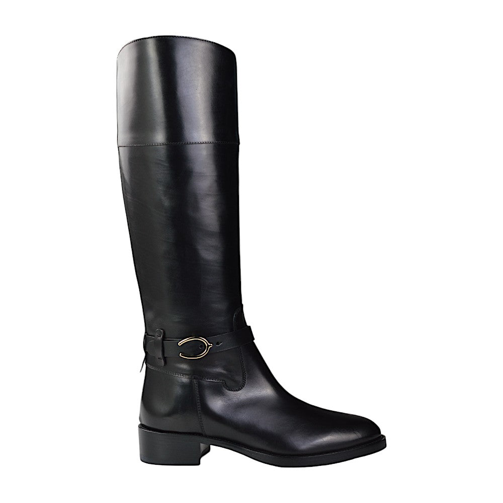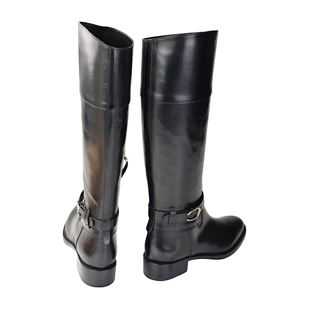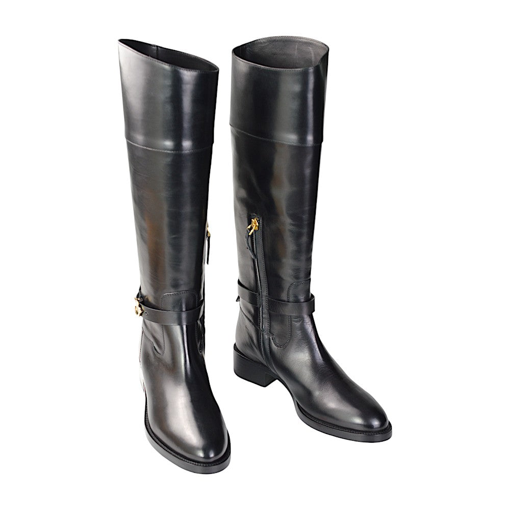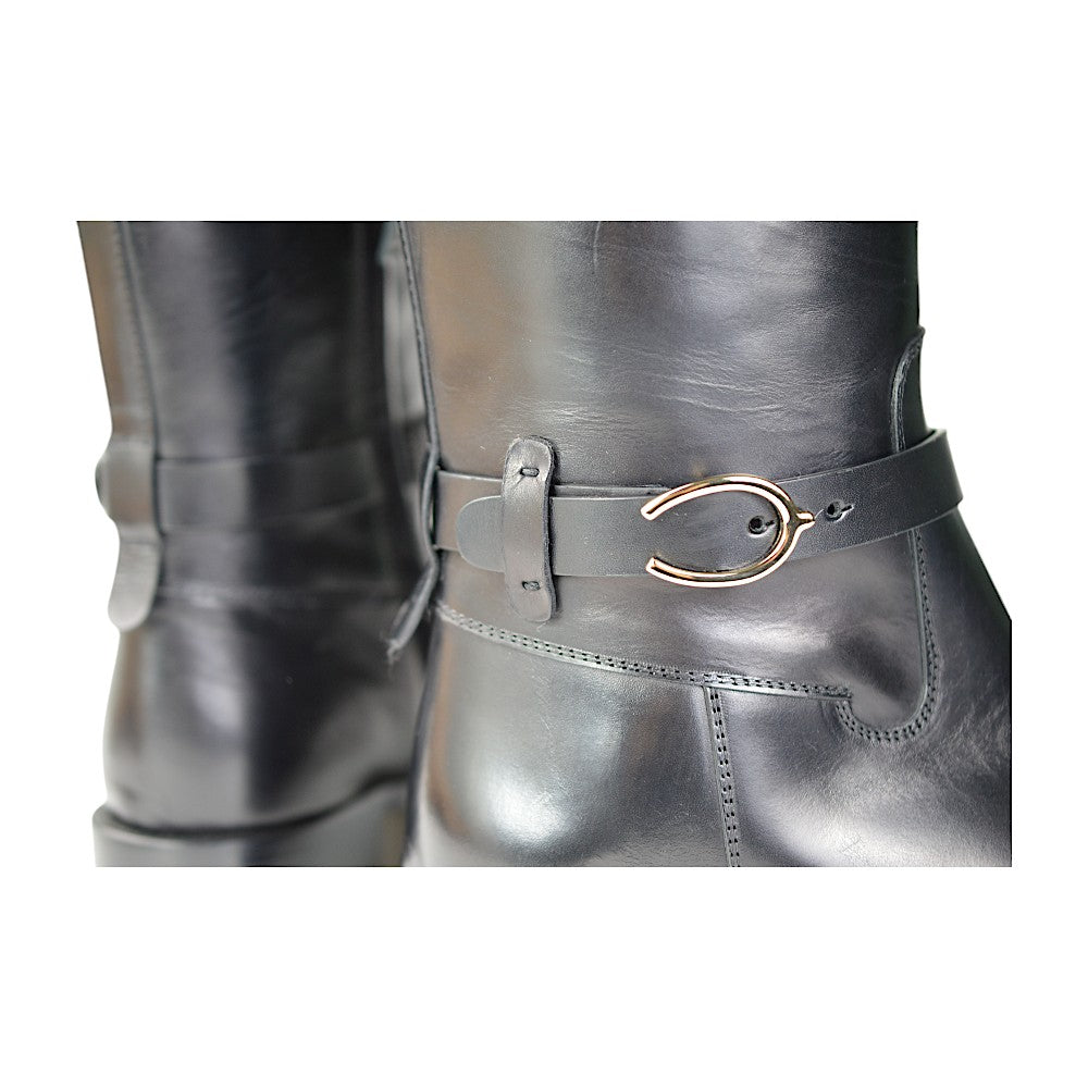 Besonders auffällig ist der Gürtelverschluss mit Hufeisen-Design auf der Außenseite, der den eleganten Look der Stiefel zusätzlich akzentuiert. Ein praktischer Reißverschluss an der Innenseite auf Knöchelhöhe erleichtert das An- und Ausziehen. Mit einer Gesamtlänge von 42 cm bieten diese Stiefel optimalen Halt und Schutz.