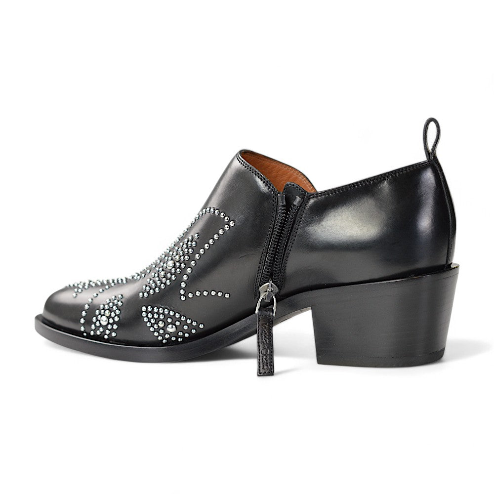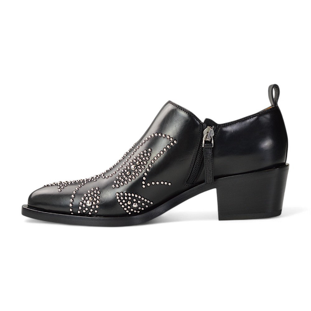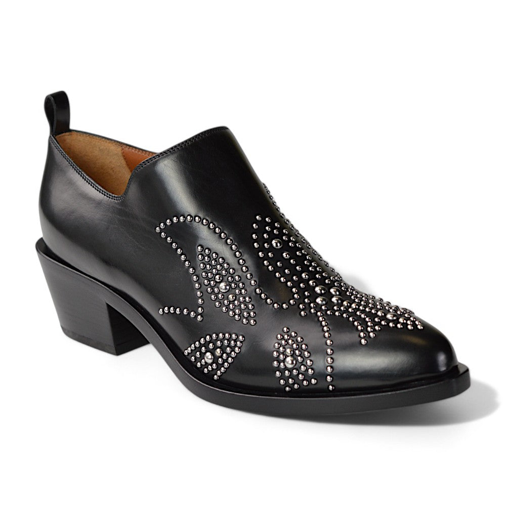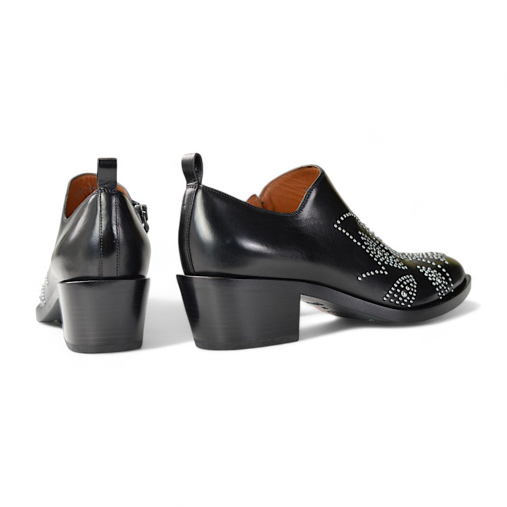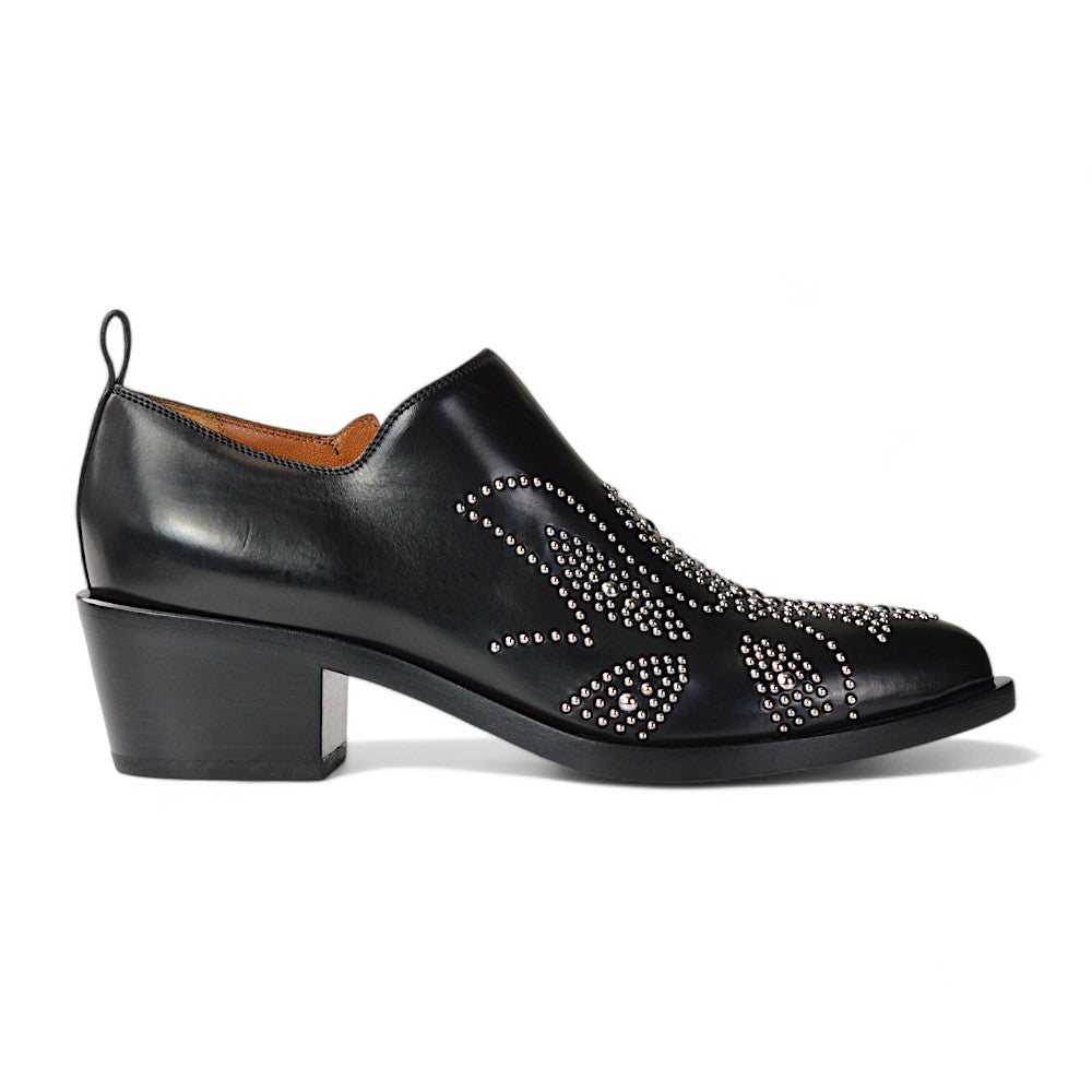 Die Pumps verfügen über dekorative Nieten, die ein auffälliges und modisches Muster auf dem Schuh bilden. Der Boden ist aus Holz gefertigt, was den Schuhen eine zusätzliche hochwertige Note verleiht.